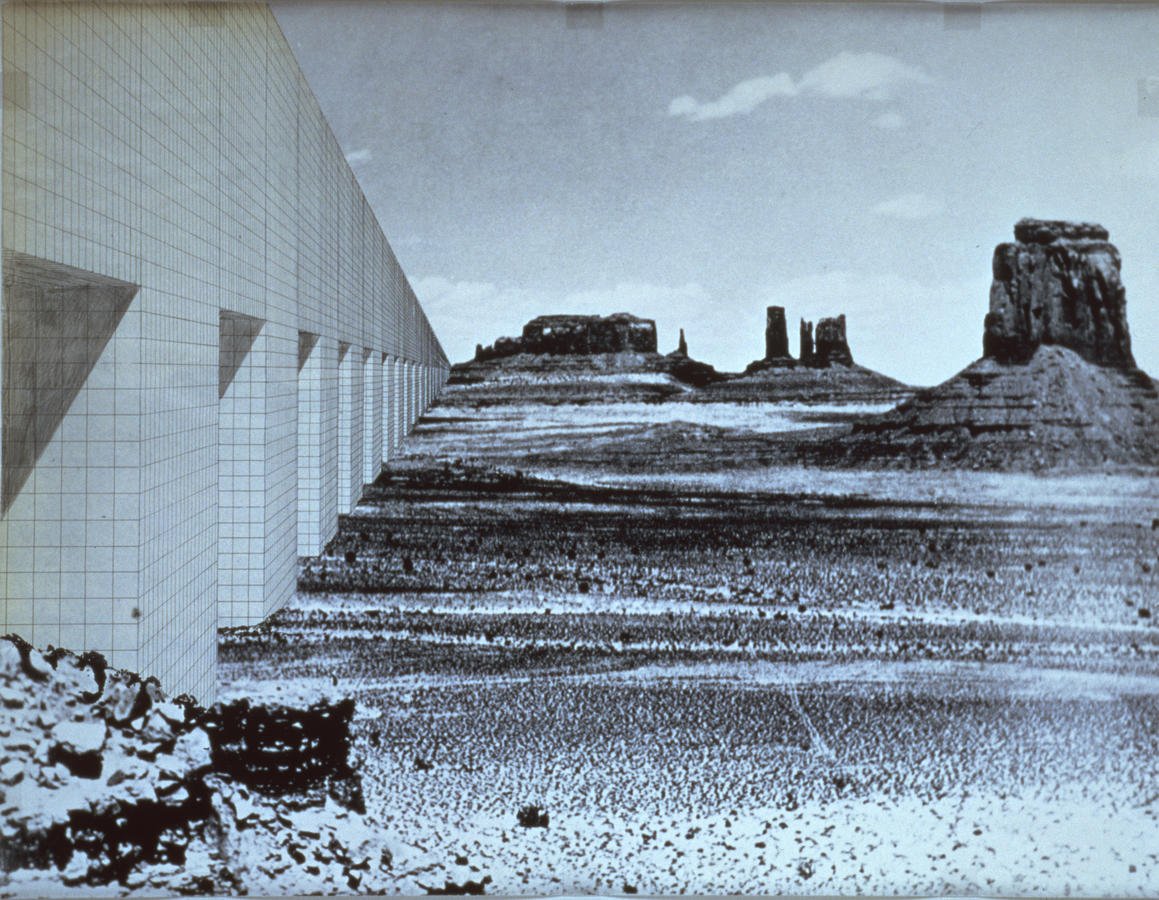 Superstudio, Il Monumento Continuo, 1969–1970, Arizona desert, 1969. Collage on photographic print. © Centre Pompidou, Mnam-CCI