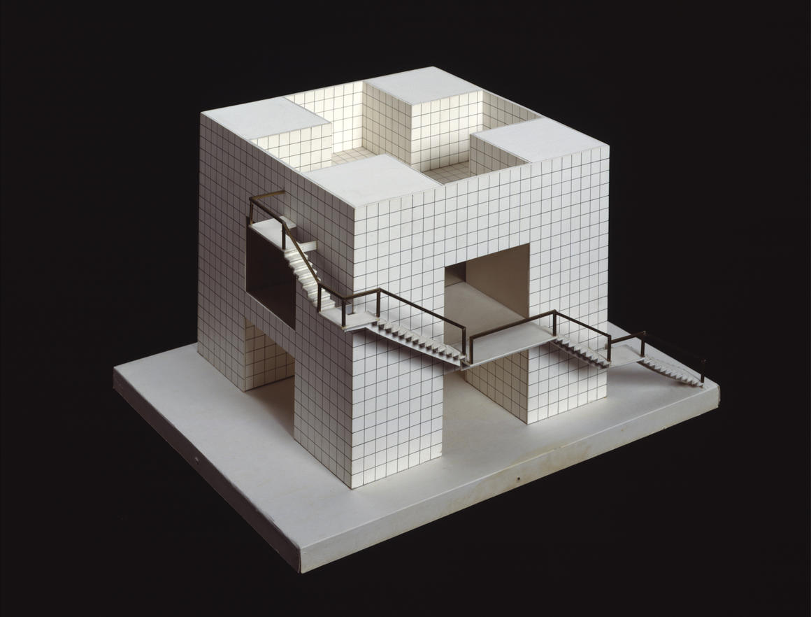Superstudio, Un catalogo di ville, 1968 – 1970, Villa suburbana A6, Villa Cubica model, 1968. Cardboard, graph paper and brass. © Centre Pompidou, Mnam-CCI