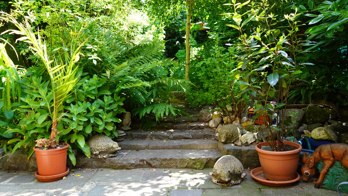 Un siècle, quelques remembrements et beaucoup d’épandages plus tard, rien n’est moins sûr. Il ne serait pas surprenant que ce petit jardin de soixante mètres carrés accueille plus d’espèces d’insectes que de nombreux hectares d’agriculture d’aujourd’hui. La ville plus riche en biodiversité que la campagne, c’est la triste réalité d’aujourd’hui. Le souhait des propriétaires est d’attirer ici le plus grand nombre de scarabées, papillons, lucioles, sphinx, … Ils ont ainsi rassemblé dans un mouchoir de poche le plus possible de petits milieux : friche, sous-bois, murs de pierres sèches, mare… Une certaine soif de nature sauvage.