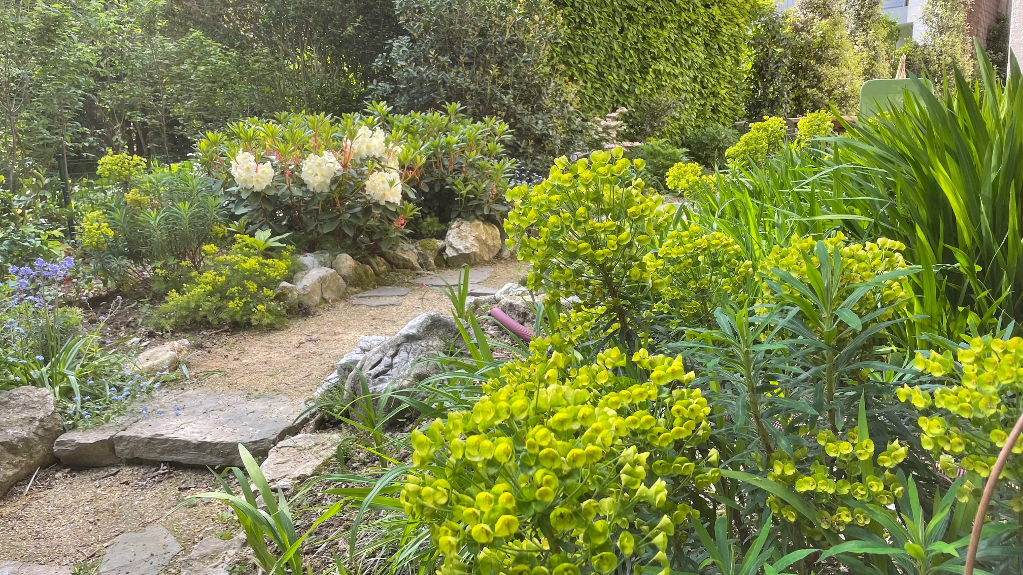 Het pad leidt langs opeenvolgende kleine hangende bloemperken, die trapsgewijs naar beneden lopen tot aan de voet van het huis. Aan de andere kant mondt een exotische tuin uit op een weide vol wilde bloemen, met helemaal achterin een verrassende collectie mossen. In deze tuin, die de wilde schoonheid van de Ierse kustlijn oproept, wist Isabelle Stevens een grote verscheidenheid aan landschappen bij elkaar te brengen...