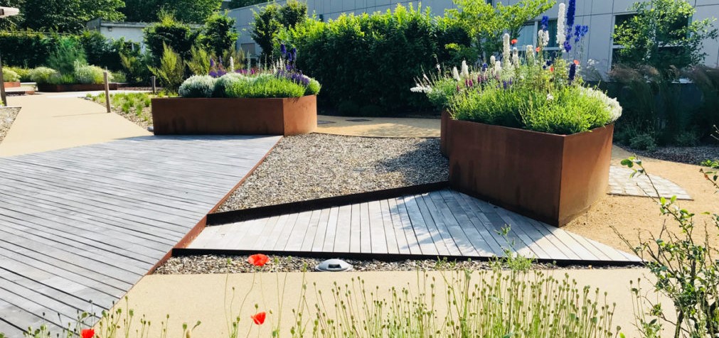 Een landschappelijke metamorfose in het ziekenhuis Molière-Longchamp: wat vroeger een gazon was, is nu een multifunctionele tuin die tot ontspanning uitnodigt. De tuin is resoluut hedendaags, met opvallende, hoekige vormen in Cor-Ten staal. Grote kluiten vaste planten en grassen vormen een vegetatieve achtergrond voor verschillende paden die elkaar kruisen. Een opeenvolging van landschappen met bomen, struiken en weelderige gazons geeft structuur aan de tuin en biedt personeel en patiënten een moment van ontsnapping.